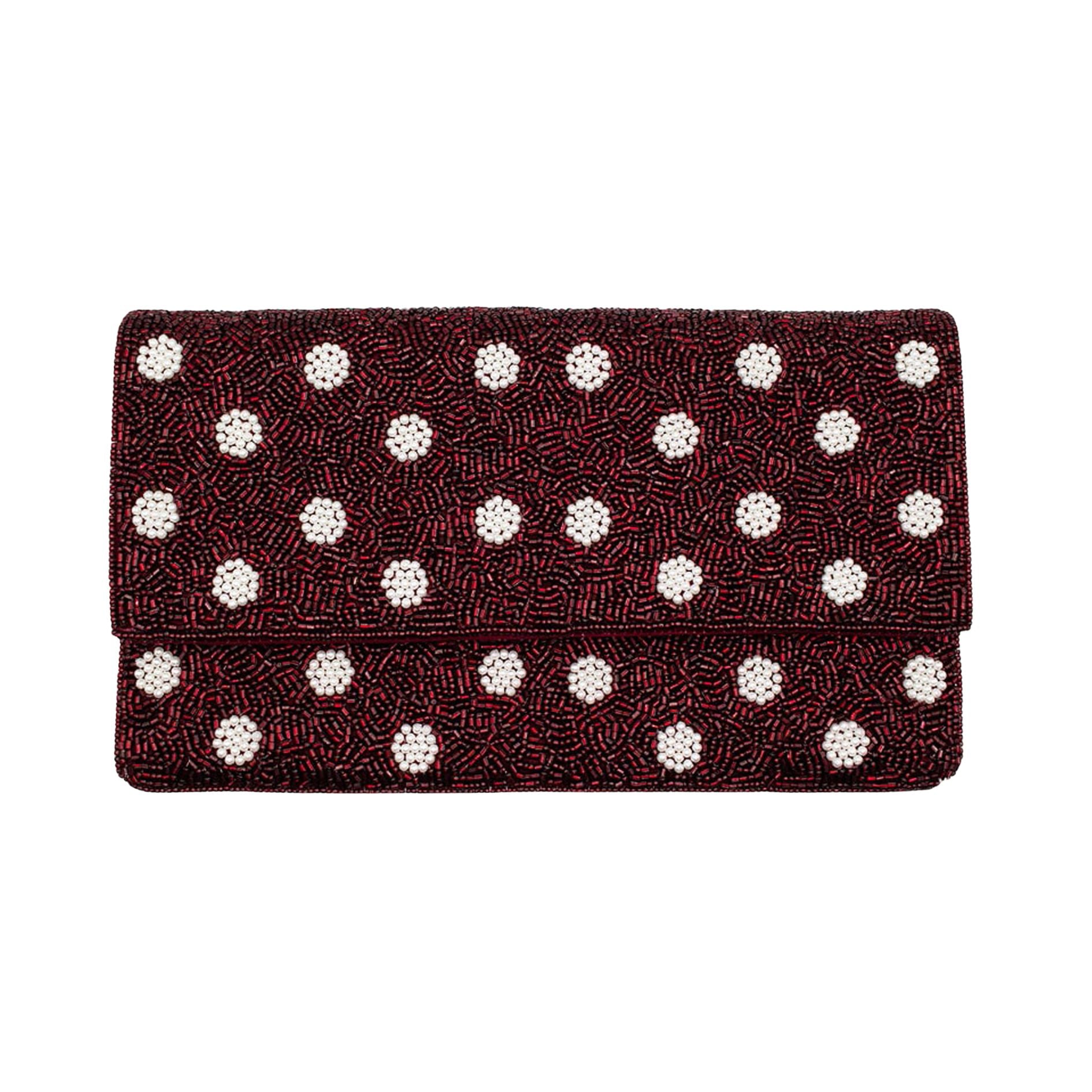 Add playful elegance to your look with the Burgundy Polka Dot Beaded Clutch. Featuring a deep burgundy background with chic white beaded polka dots, this clutch is perfect for dressing up any outfit with timeless style.