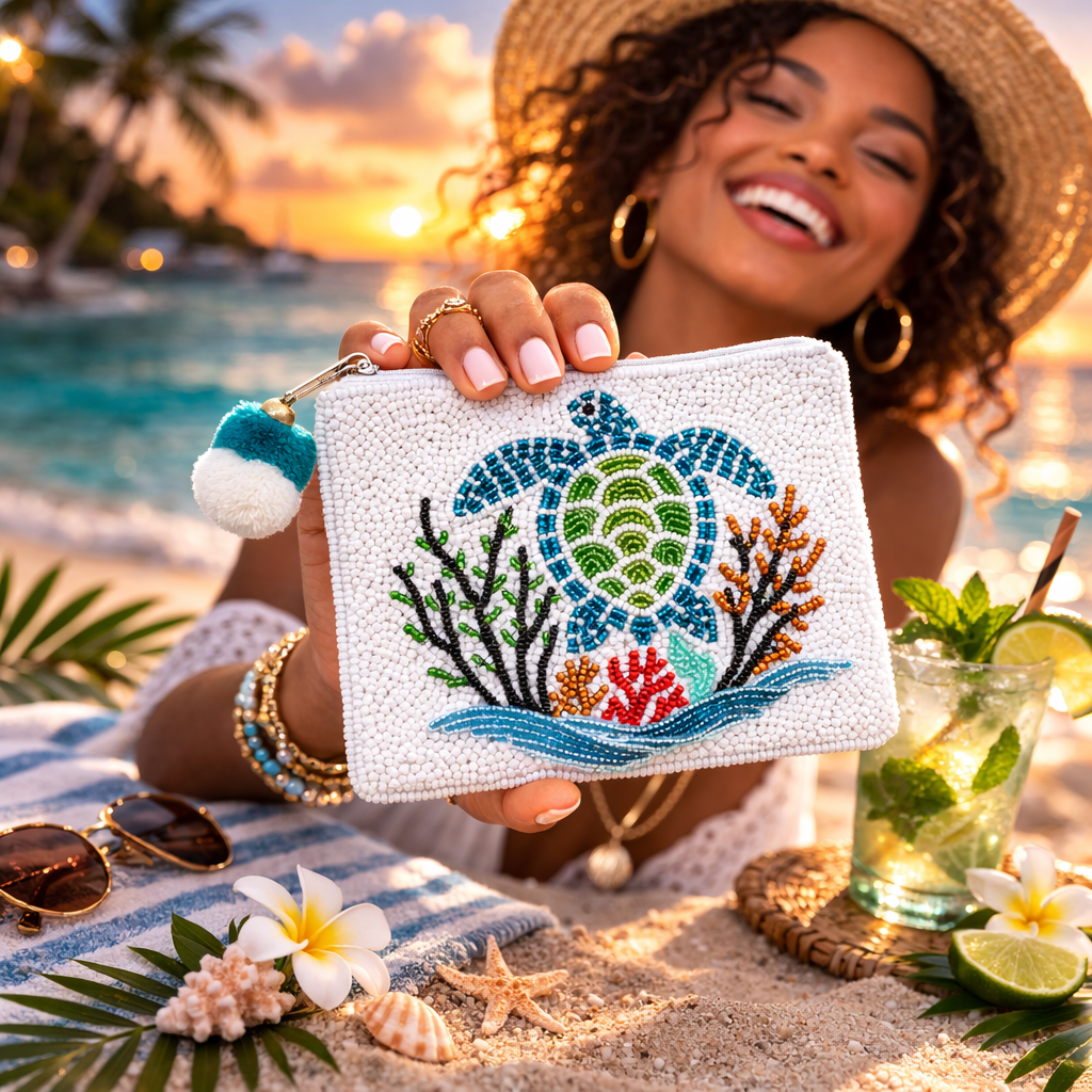 Add a pop of color to your accessories with the Blue Turtle Beaded Pouch! This 5.5 x 4.5-inch handmade coin pouch from India features stunning blue beadwork and a soft 100% cotton interior. With a zipper closure and a cute pom pom accent, it’s perfect for boutiques, gift shops, or lifestyle stores. Customers will love its vibrant design and the blend of functionality and style, making it a must-have for any fashionista looking for something unique and fun.