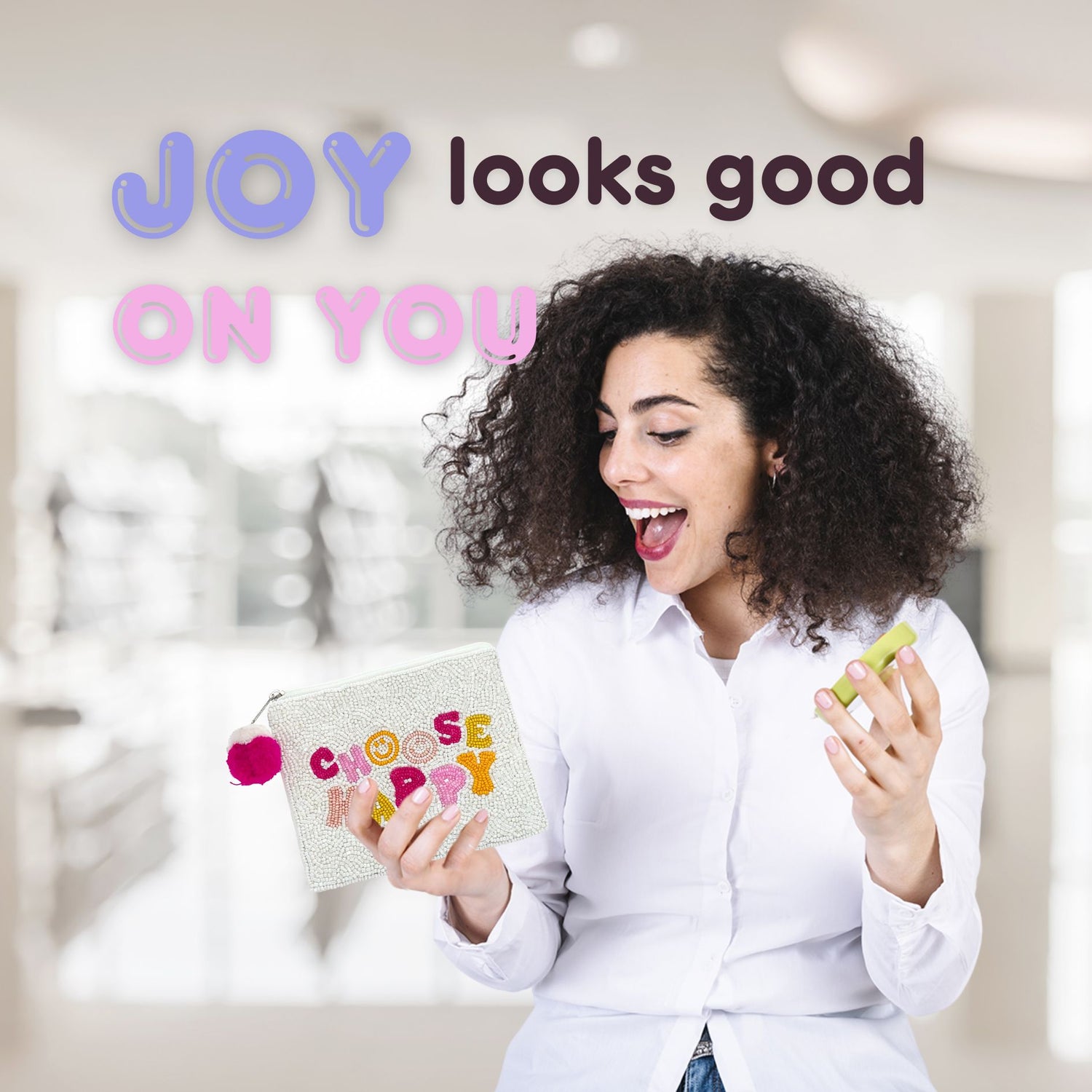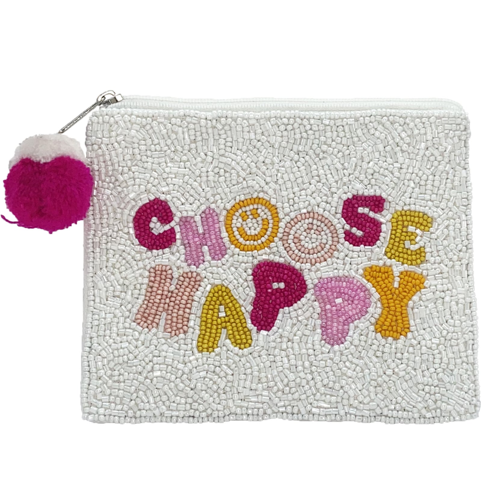 Embrace positivity with our Choose Happy Beaded Coin Pouch. The single-sided design features a vibrant beaded "Choose Happy" message, adding a cheerful touch to your accessory collection. The secure zipper closure, enhanced with a playful pom-pom, combines functionality with a fun detail to keep your coins, cards, and small items safe. Perfect for adding a splash of positivity to your daily routine or as a thoughtful gift, this beaded coin pouch stands out with its unique design and high-quality craftsmanship.