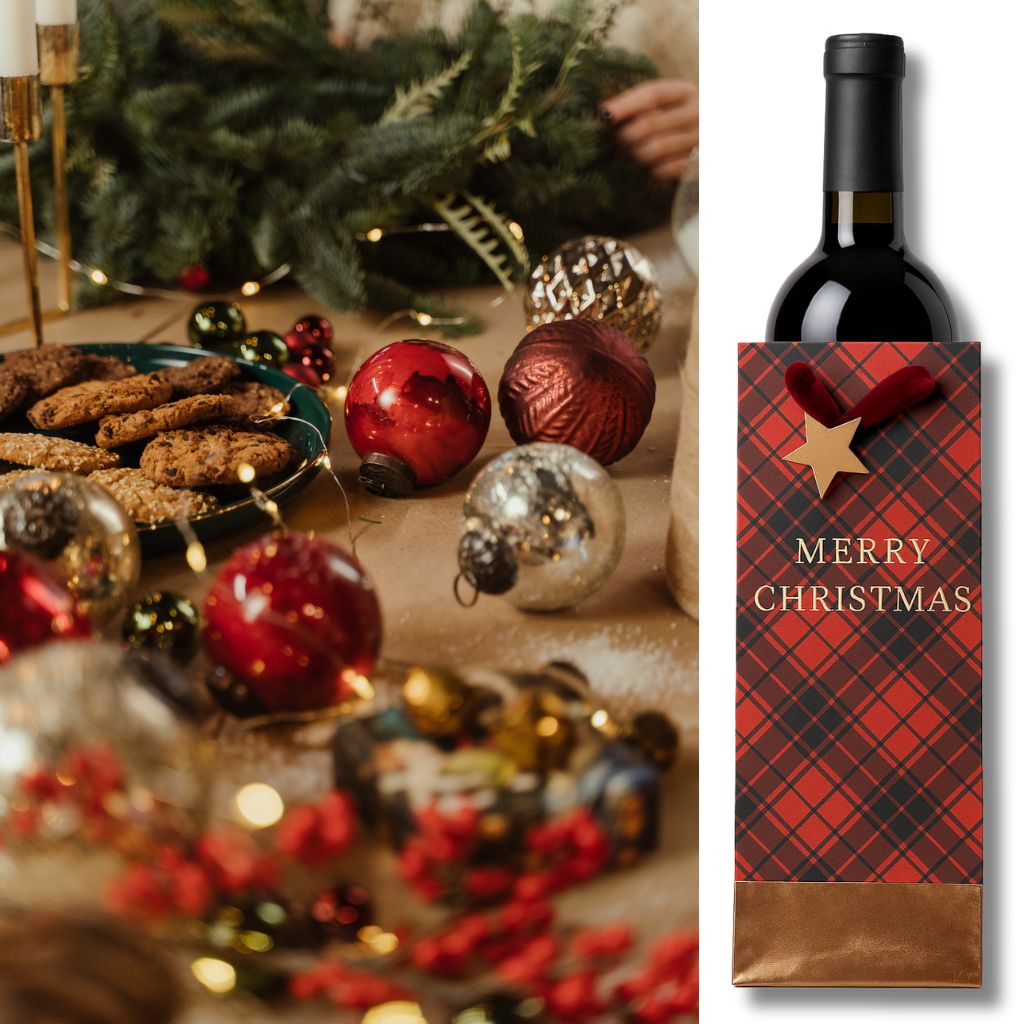 Dress up your holiday wine gifts with this elegant Christmas wine bag featuring a classic red-and-black tartan print, a gold foil base, and the warm “Merry Christmas” greeting in shining letters. Finished with a gold star tag and soft velvet ribbon handles, it’s the perfect festive touch for your bottles!