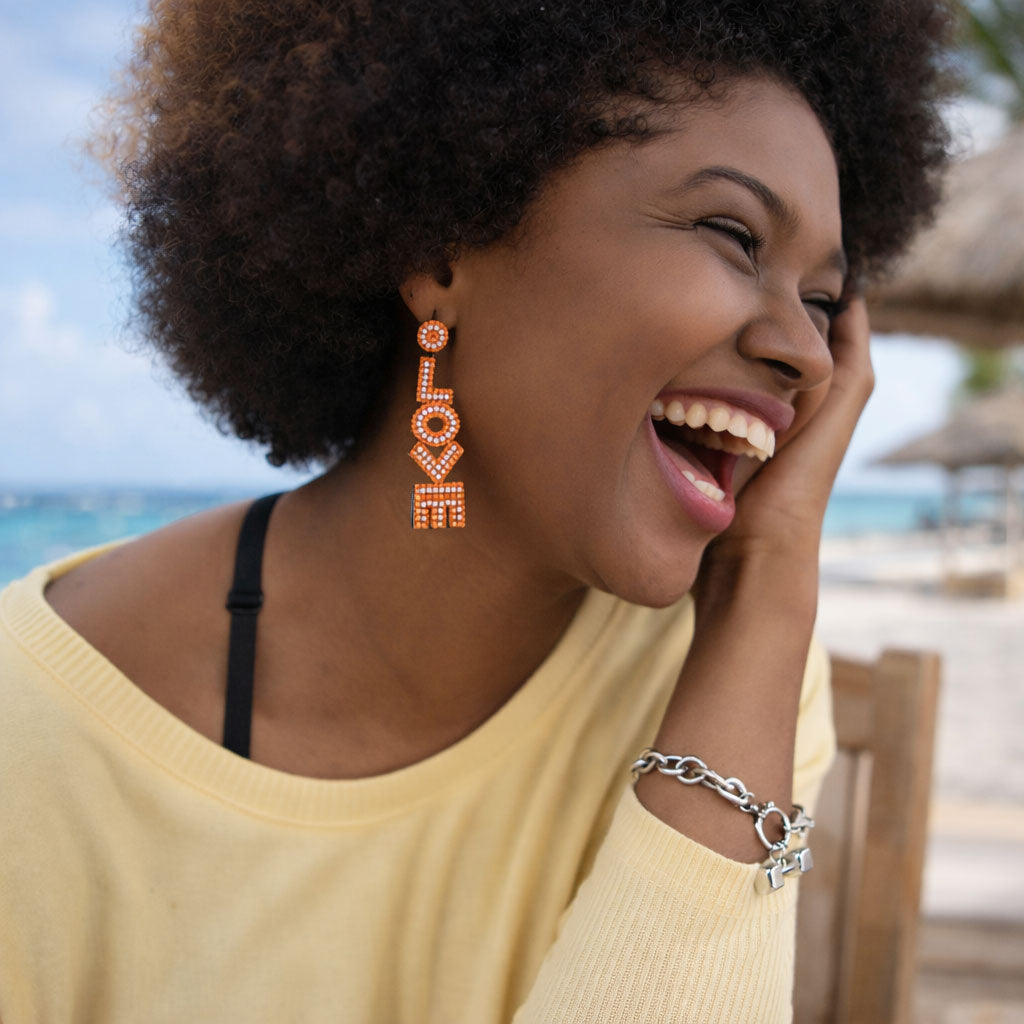 Turn up the volume on love. These hand-beaded statement earrings spell LOVE in vibrant red beads with shimmering crystal details. Fun, flirty, and full of personality, they’re made for bold outfits, happy moods, and anyone who believes love should always be worn loud and proud.