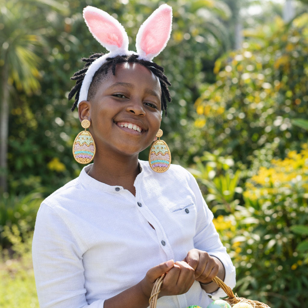 These beaded egg-shaped earrings are a celebration of color and charm. Designed in soft pastel stripes with golden accents, they feel fresh, fun, and full of spring energy. Lightweight and eye-catching, they’re perfect for Easter celebrations, brunch dates, or adding a happy pop of color to everyday outfits.