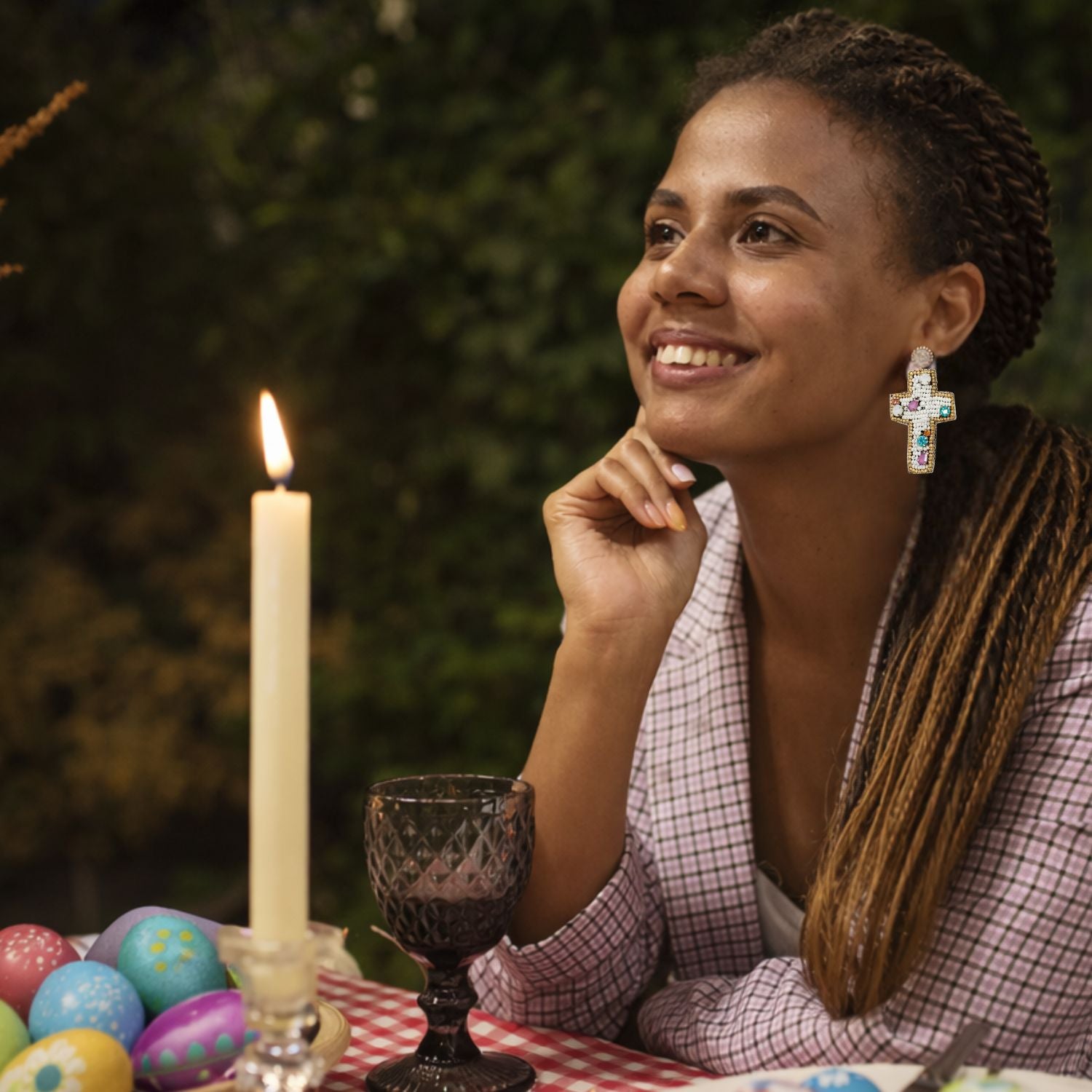 Beautifully beaded cross earrings accented with soft pastel crystals, blending faith, elegance, and Easter charm into one meaningful statement piece.
