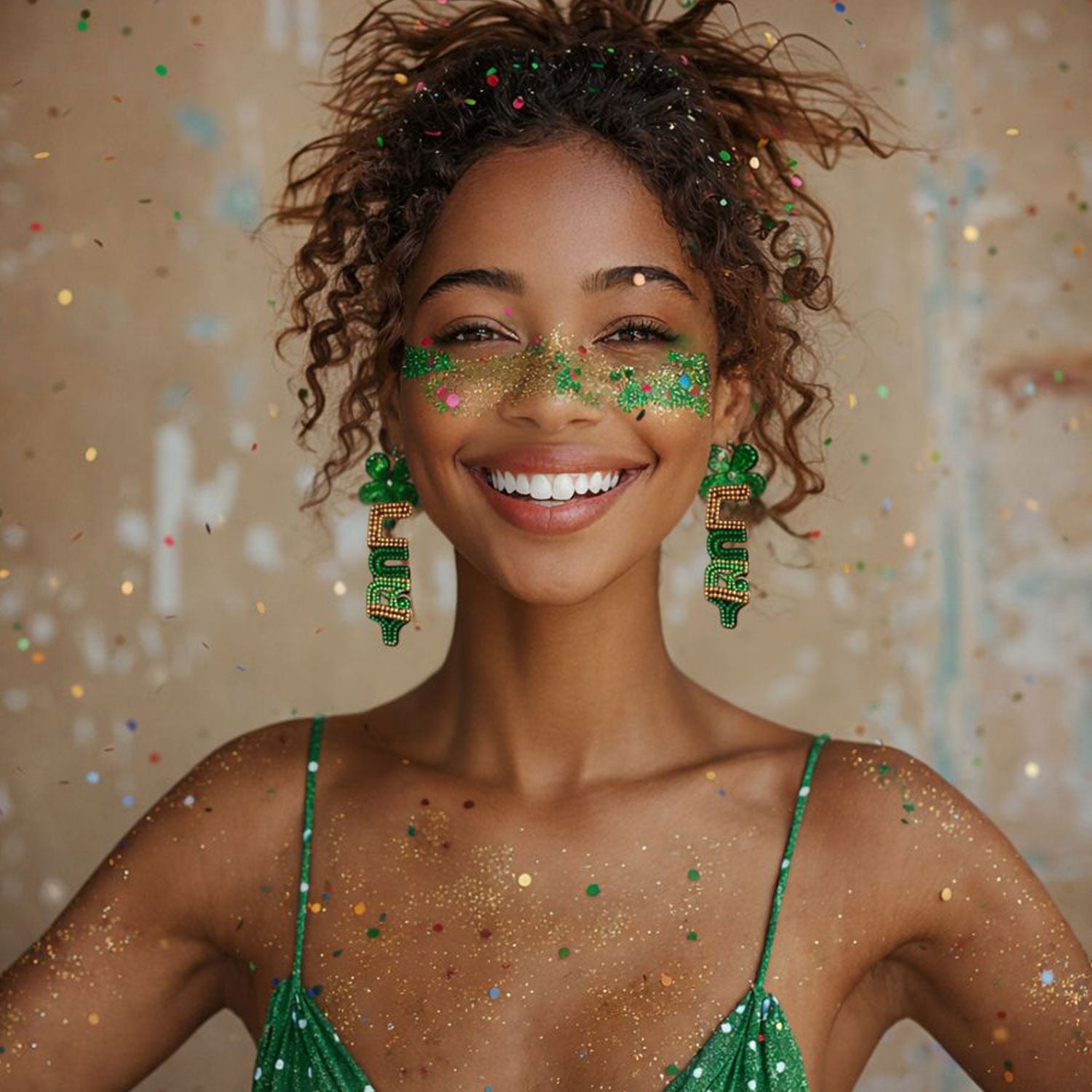Playful, hand-beaded statement earrings spelling LUCKY in festive green and gold, made for St. Patrick’s Day celebrations.