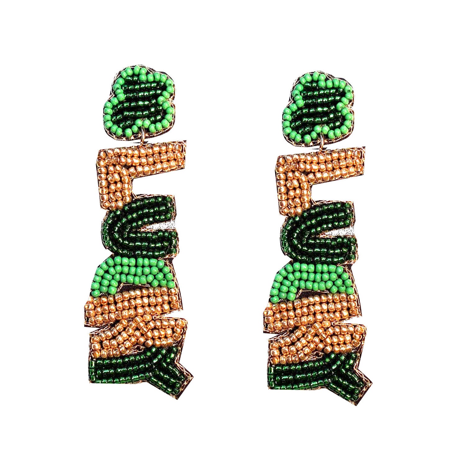 Feeling lucky? These bold LUCKY earrings are hand-beaded in vibrant shades of green with warm gold accents for a festive St. Patrick’s Day look. Lightweight yet eye-catching, they add instant fun and charm, because luck looks good on you.