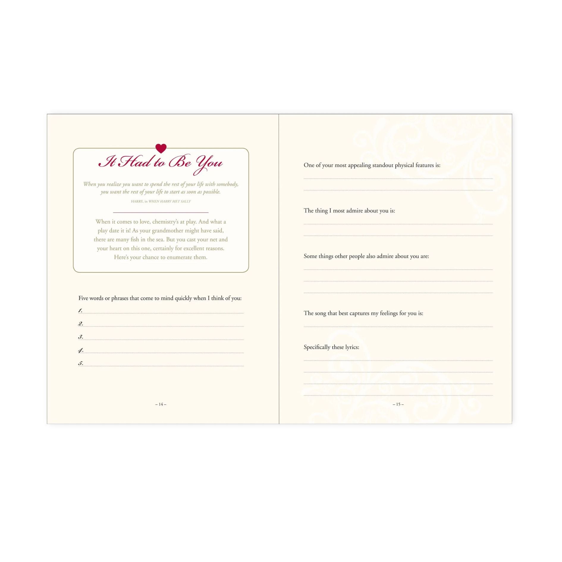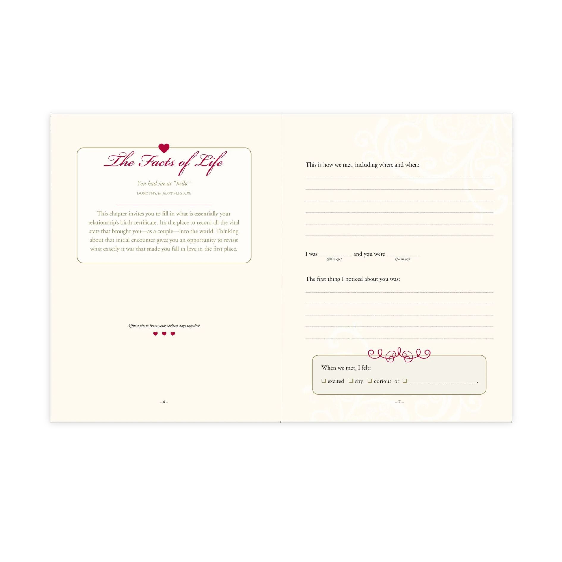 Write your love story in your own words! Designed to be filled out by one partner and given to the other, or to be explored as a couple, the prompts and questions in this guided journal offer fun and insight into your relationship. Provides plenty of space for answers and photos.