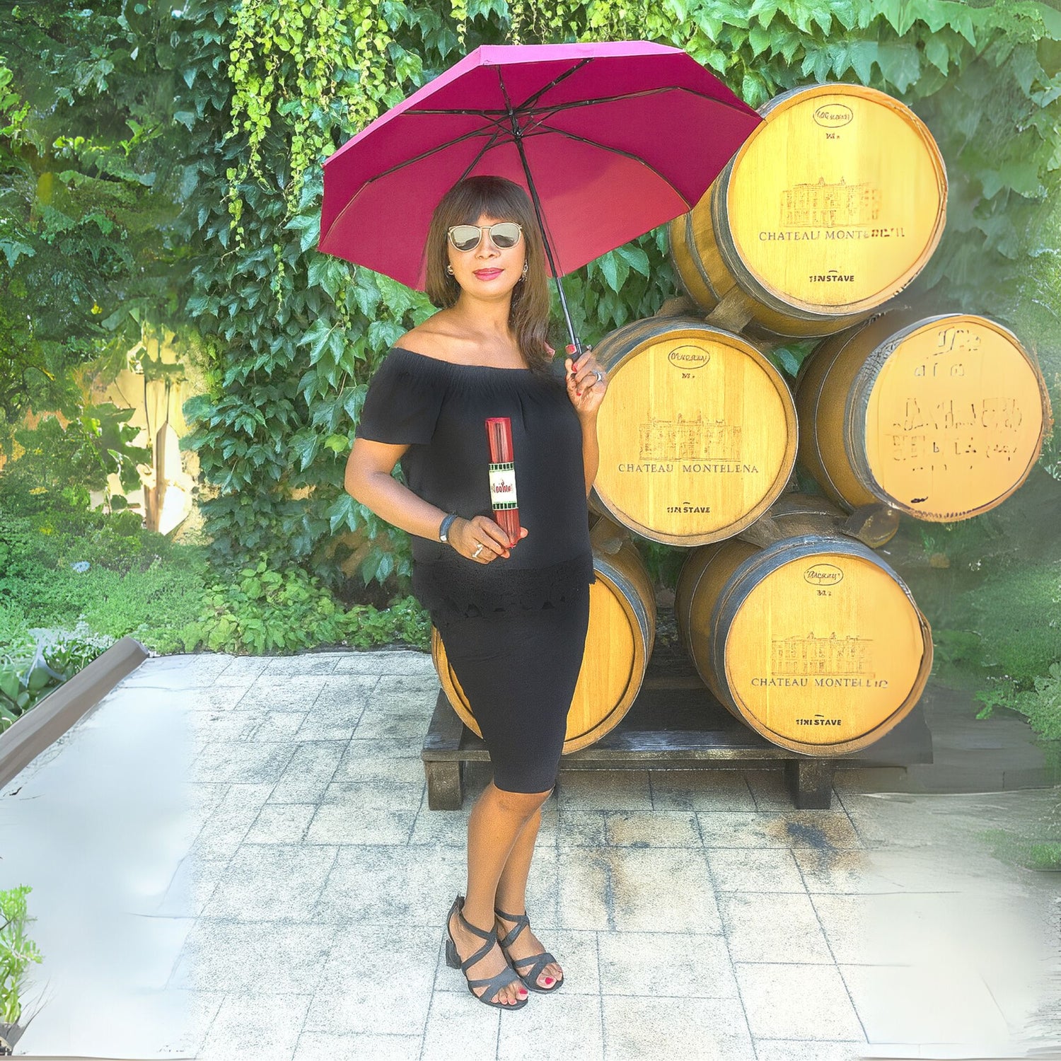 Burgundy tones meet bottle-inspired design for a rainy-day accessory that's as tasteful as your wine rack.