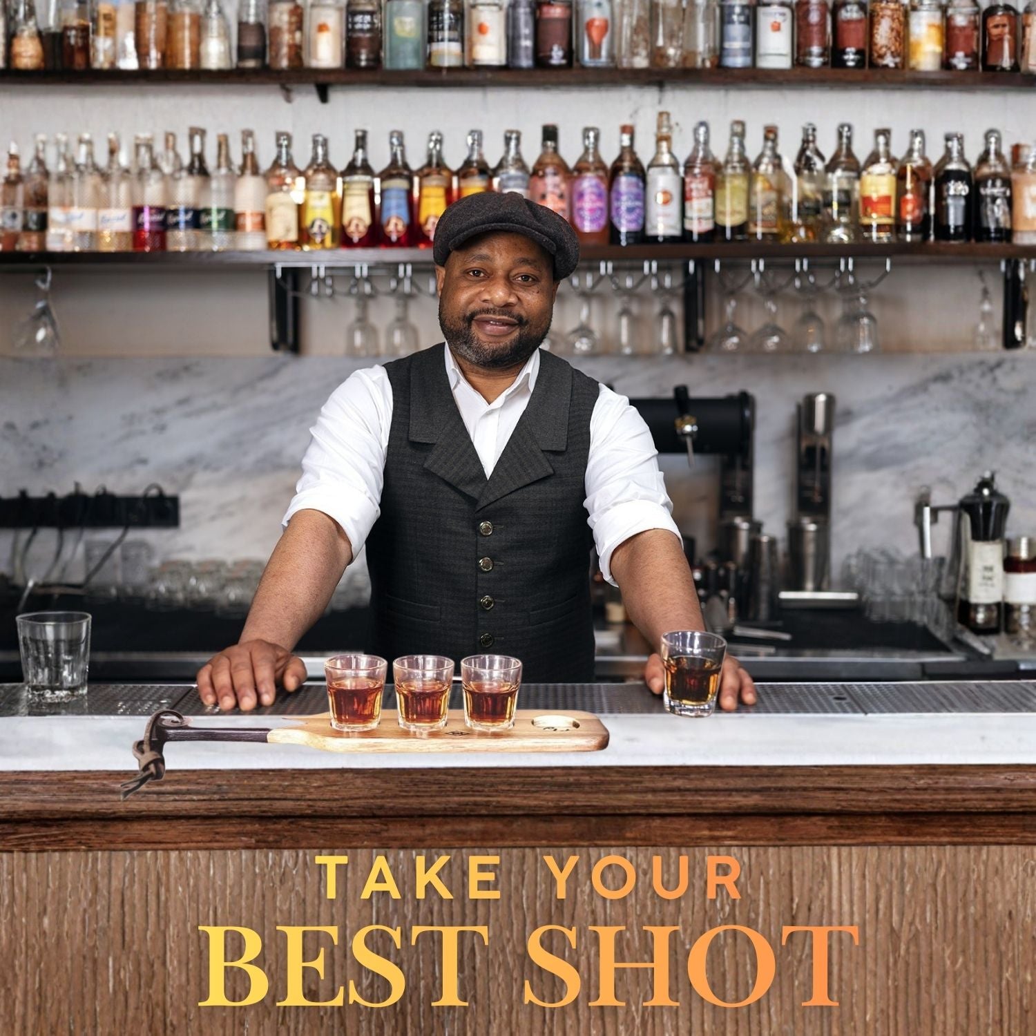 Inspiré des bars de montagne des Alpes autrichiennes, où des shots de schnaps maison sont proposés sur des plateaux en bois de forme spéciale