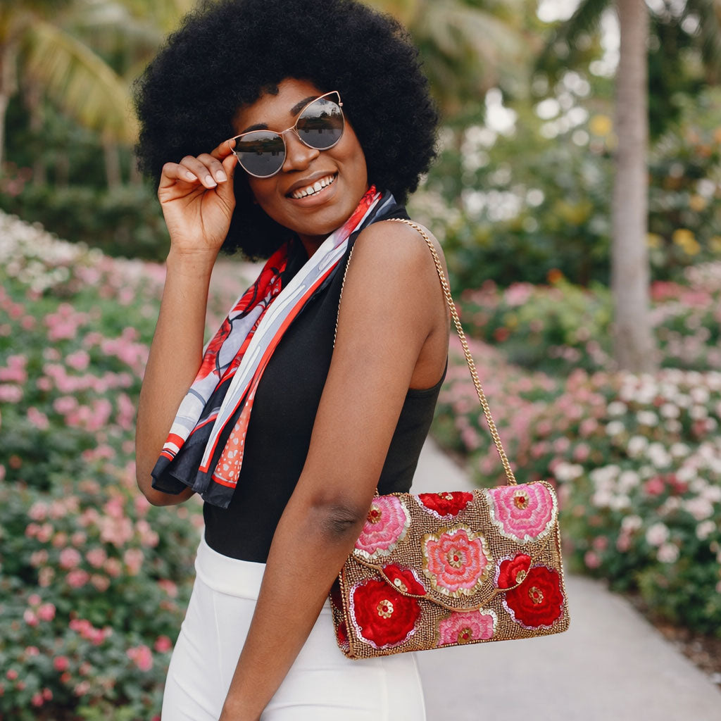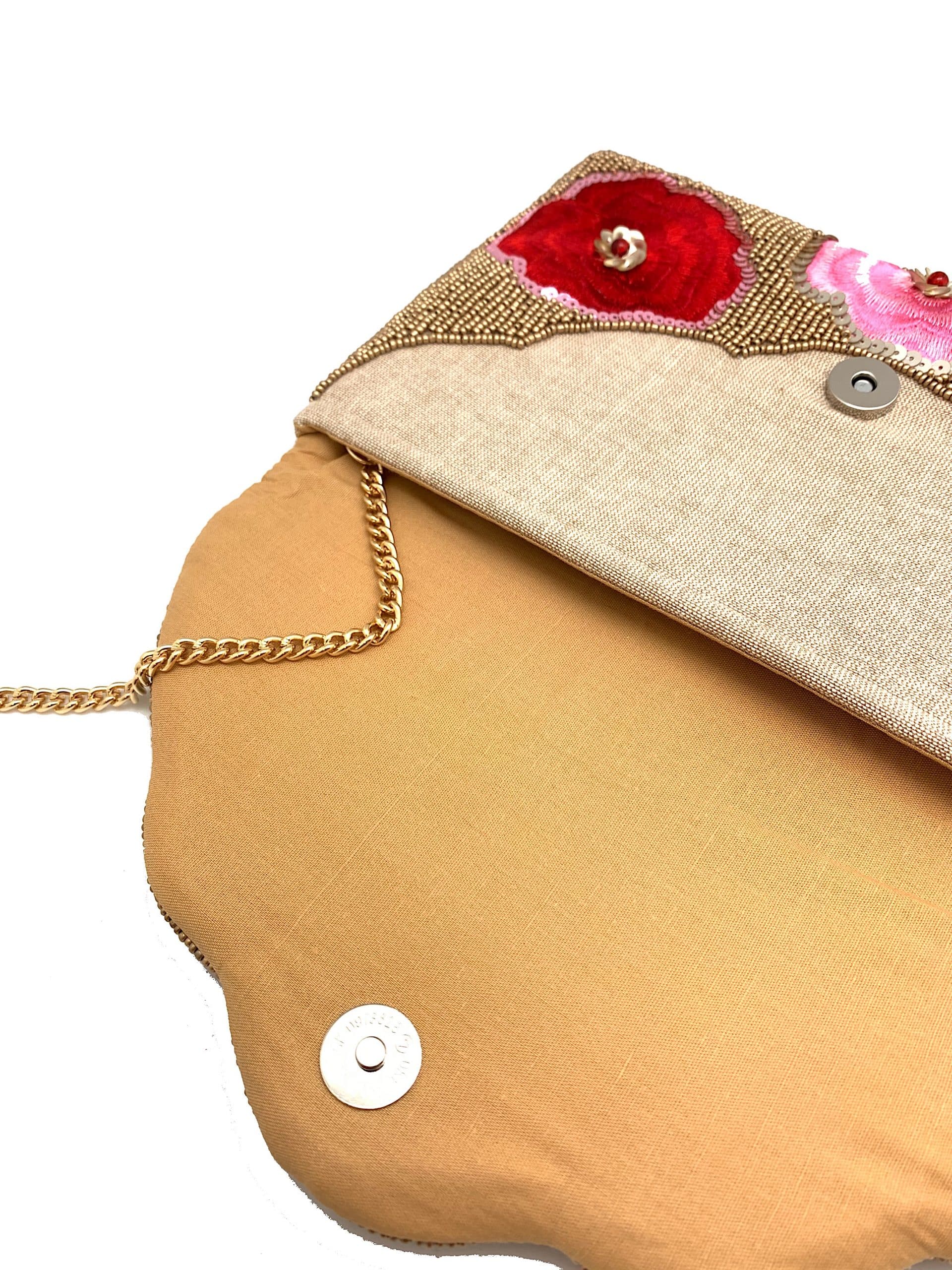 Add a touch of elegance and charm to your accessory collection with our Gold and Pink Floral Beaded Clutch. This beautiful clutch combines luxurious gold with delicate pink floral patterns for a sophisticated and eye-catching design. Perfect for adding a glamorous touch to your wardrobe or as a thoughtful gift, this beaded clutch is an elegant accessory that stands out with its beautiful design and craftsmanship.