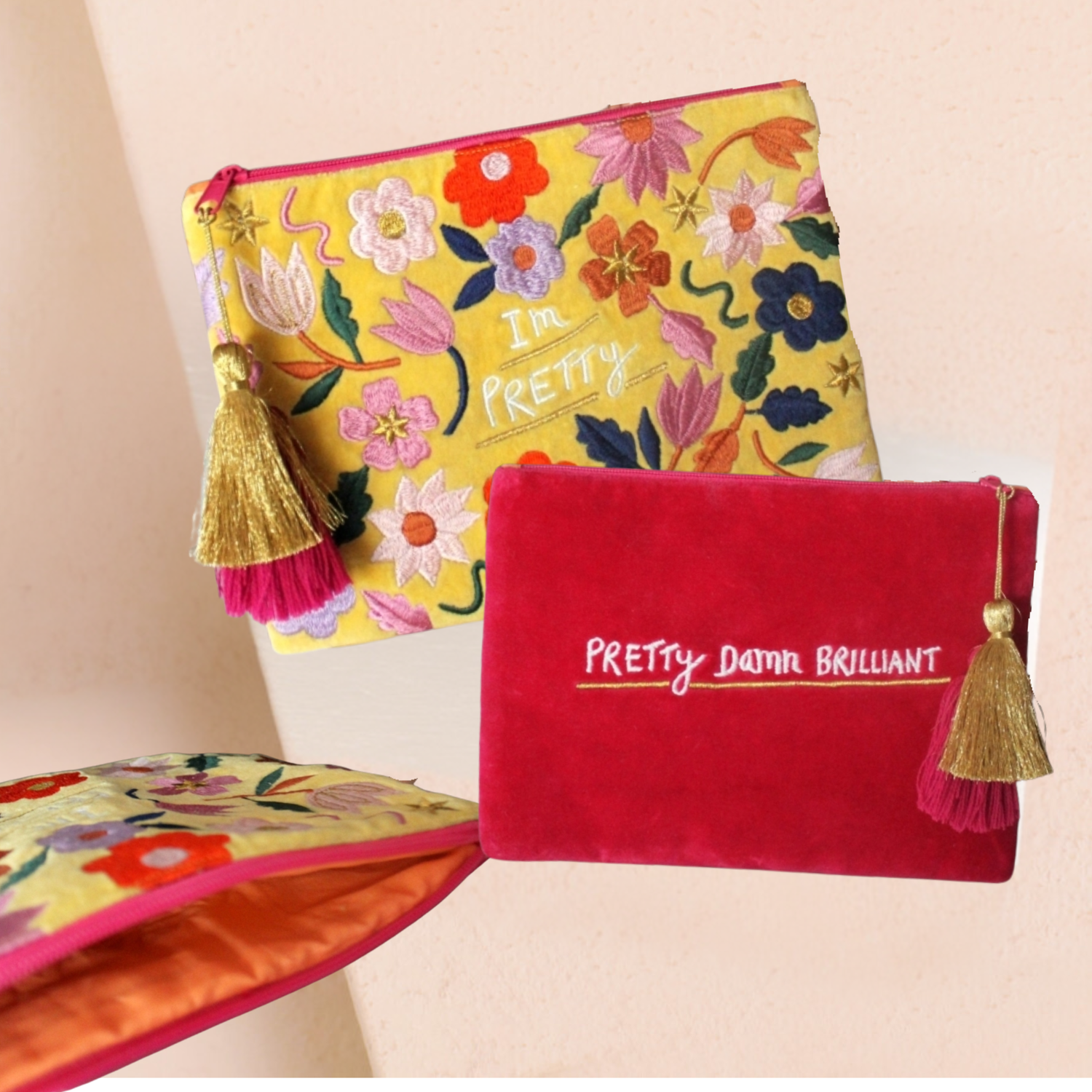 Gardez tous vos essentiels du quotidien au même endroit grâce à cette magnifique trousse à maquillage. Confectionnée en velours jaune et rose vif, elle est entièrement brodée d'un joli motif floral. Elle est également dotée d'un message secret : retournez la pochette pour lire le message complet : « Je suis jolie, vraiment géniale ! » La fermeture éclair à double pompon s'ouvre sur un grand compartiment unique, idéal pour ranger maquillage, produits de toilette, bijoux… bref, tout ce qui traîne habituellement au fond de votre sac ! Un cadeau idéal pour une amie qui a le même sens de l'humour.