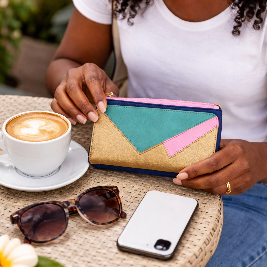 Ce portefeuille classique et contemporain comprend une poche avant à motifs avec des empiècements triangulaires en cuir aux couleurs vives et métallisées, et une fermeture à bouton-pression pour plus de sécurité. Il offre un espace de rangement généreux pour toutes vos cartes, billets et pièces. Compatible avec les végétaliens, il est doté de fentes pour cartes en cuir noir et de poches supplémentaires.