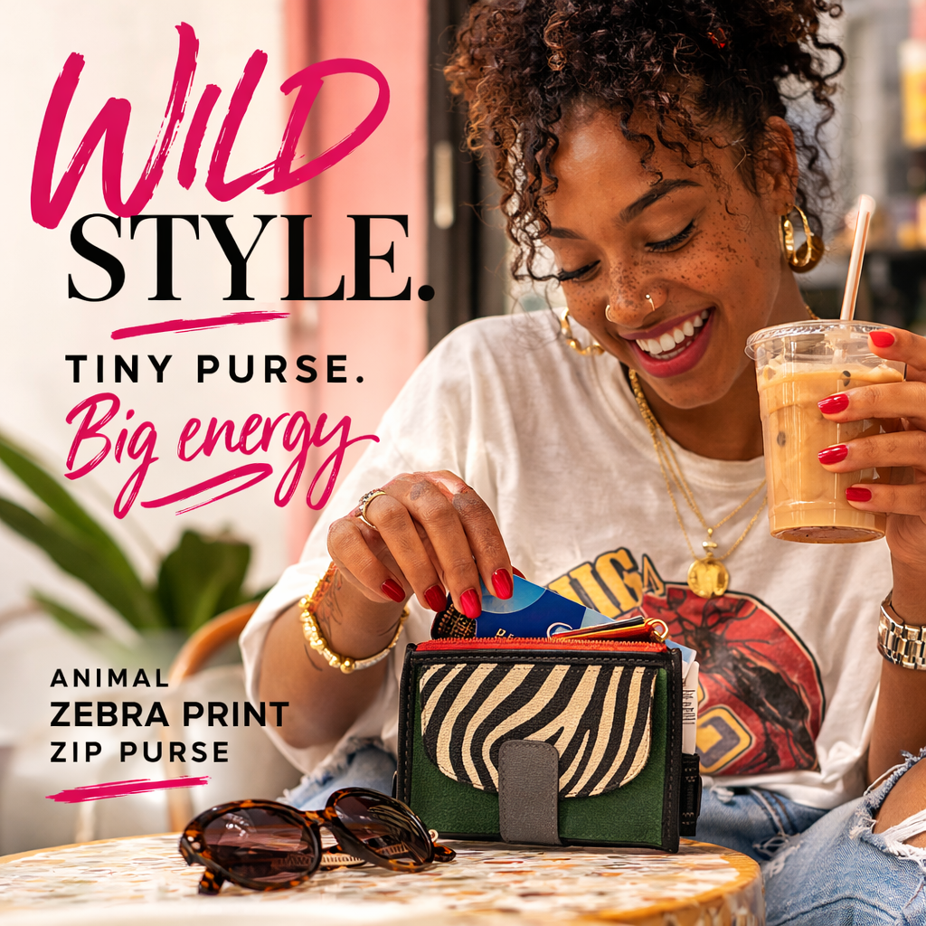 Ce porte-monnaie compact vous transporte dans la jungle avec son rabat à imprimé zèbre saisissant, sa base vert forêt et sa fermeture éclair rouge vif. C'est l'accessoire idéal pour contenir cartes, pièces et compliments.