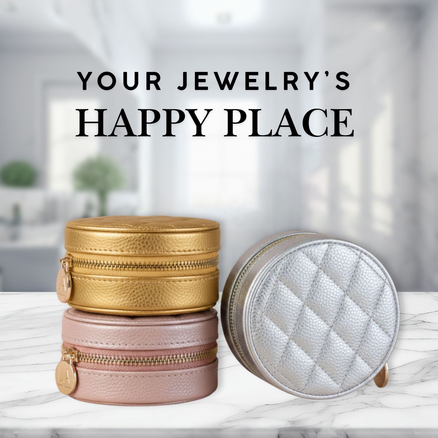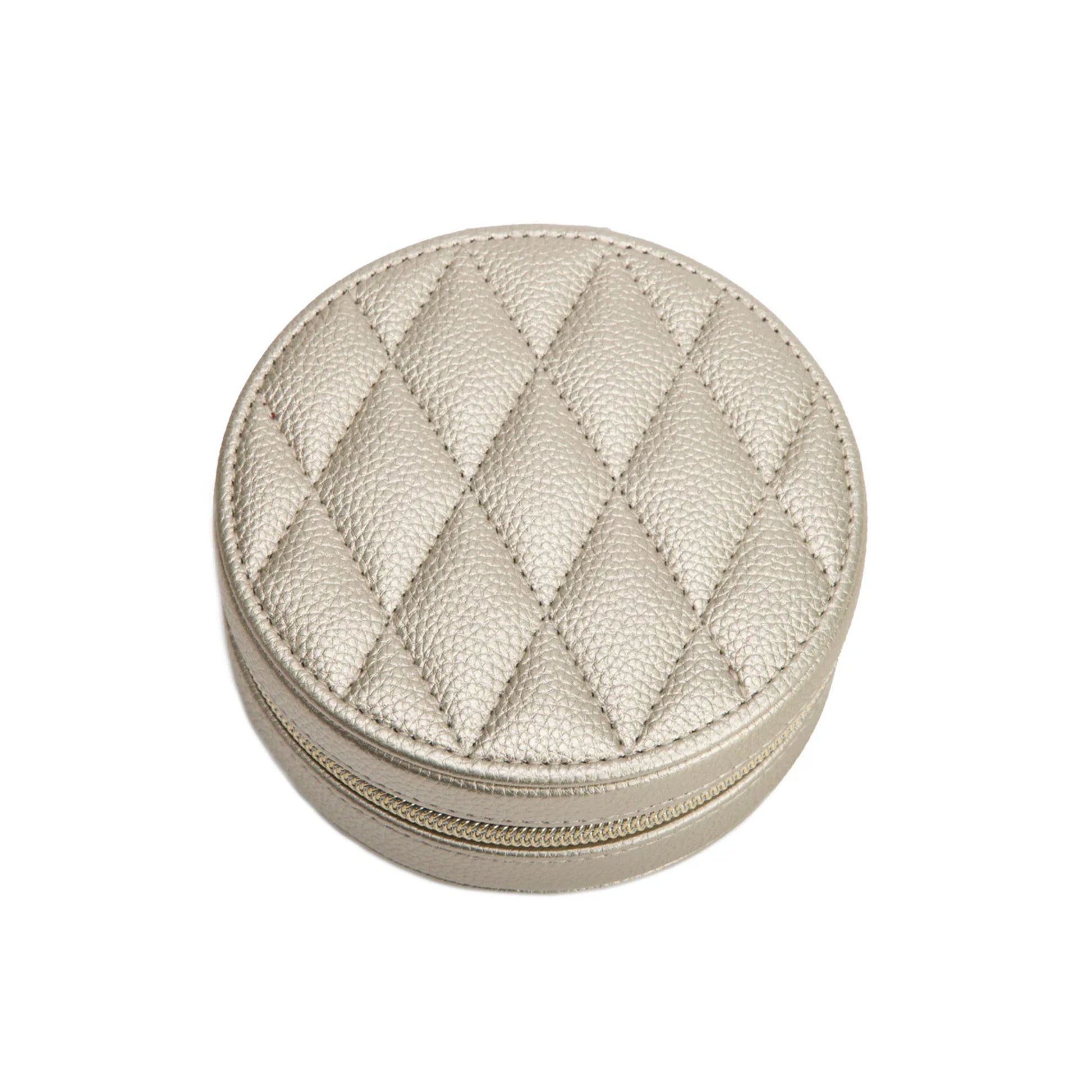 Introducing Leah Quilted Round Travel Jewelry Case, crafted with premium quilted vegan leather, this stylish case is a practical storage solution. Not just for travel, it is perfect for everyday use as well. Keep it on your dresser or vanity for easy access to your go-to pieces or take it with you to the gym or office. Compact and lightweight, it fits effortlessly in your purse or luggage, making it the ideal companion for any occasion.