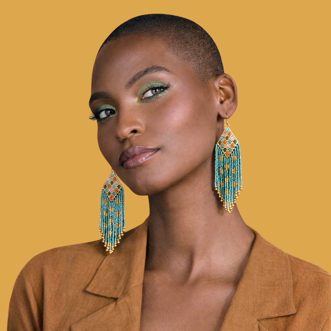 These handwoven fringe drops blend soft turquoise, sun-washed neutrals, and gleaming gold for a look that feels both earthy and elevated. The diamond-patterned top transitions into flowing bead strands that sway beautifully with every step. Lightweight, artisanal, and full of personality, perfect for beach dresses, linen, and slow summer evenings.