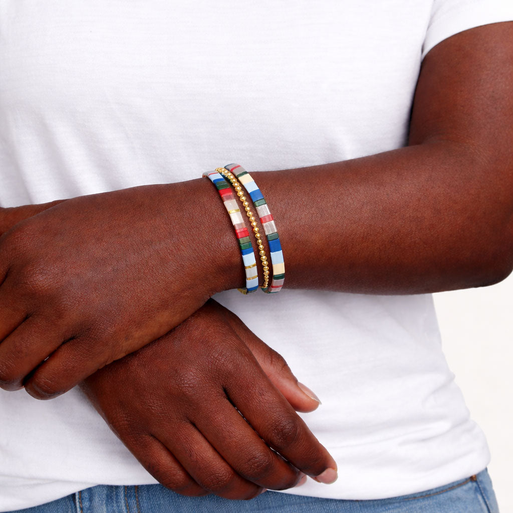 Meet your new favorite stack: glossy gold beads paired with color-blocked tiles for that perfect “I didn’t try, but I look fabulous” vibe. Works with jeans, linen, and island sunsets.