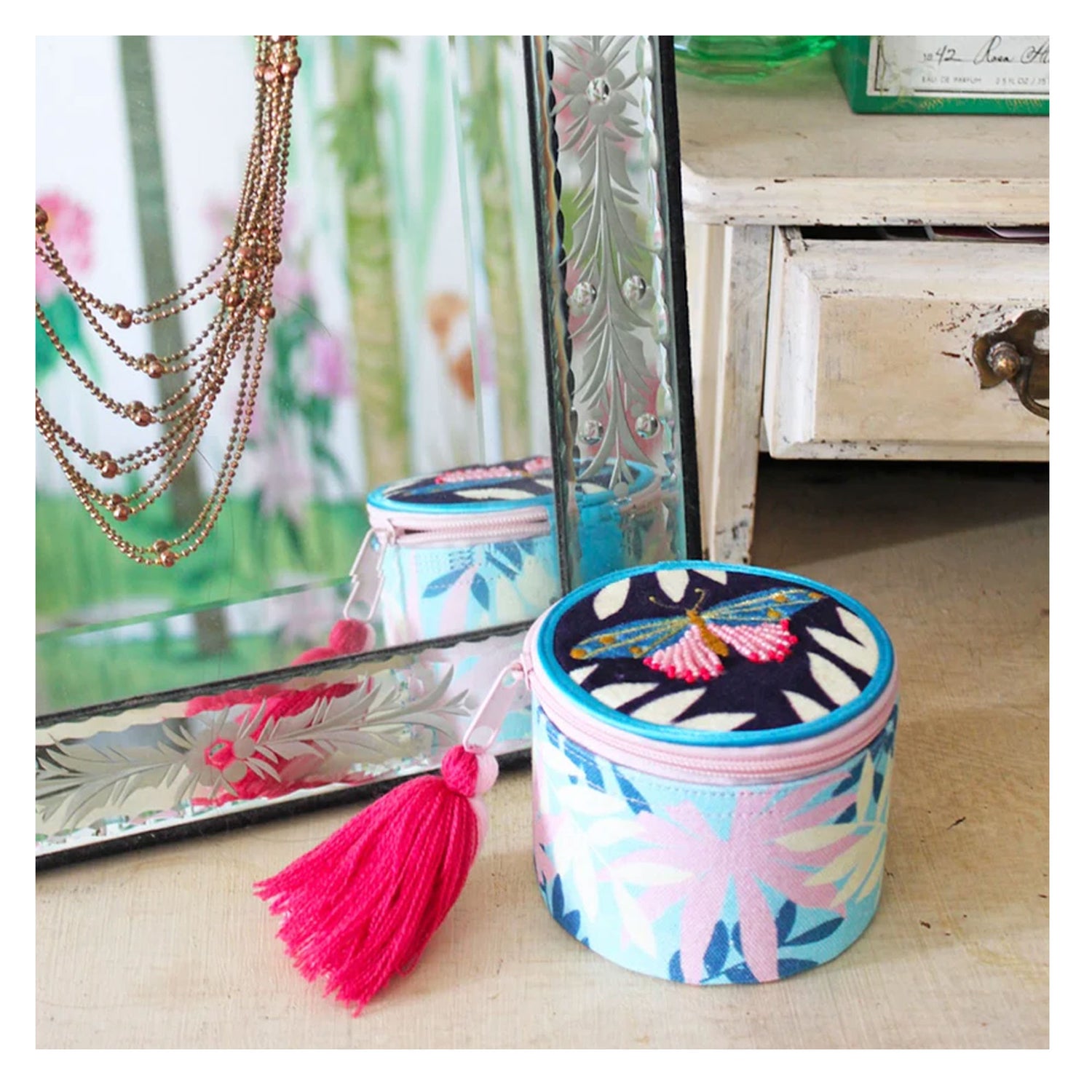 A soft Jewelry box featuring a beautifully embroidered shell with beading and gold details. The body of the box features a colorful butterfly print. Finished with contrast satin piping, and a wool tassel with a pearl bead. Its the perfect travel accessory for keeping your favorite jewellery safe.