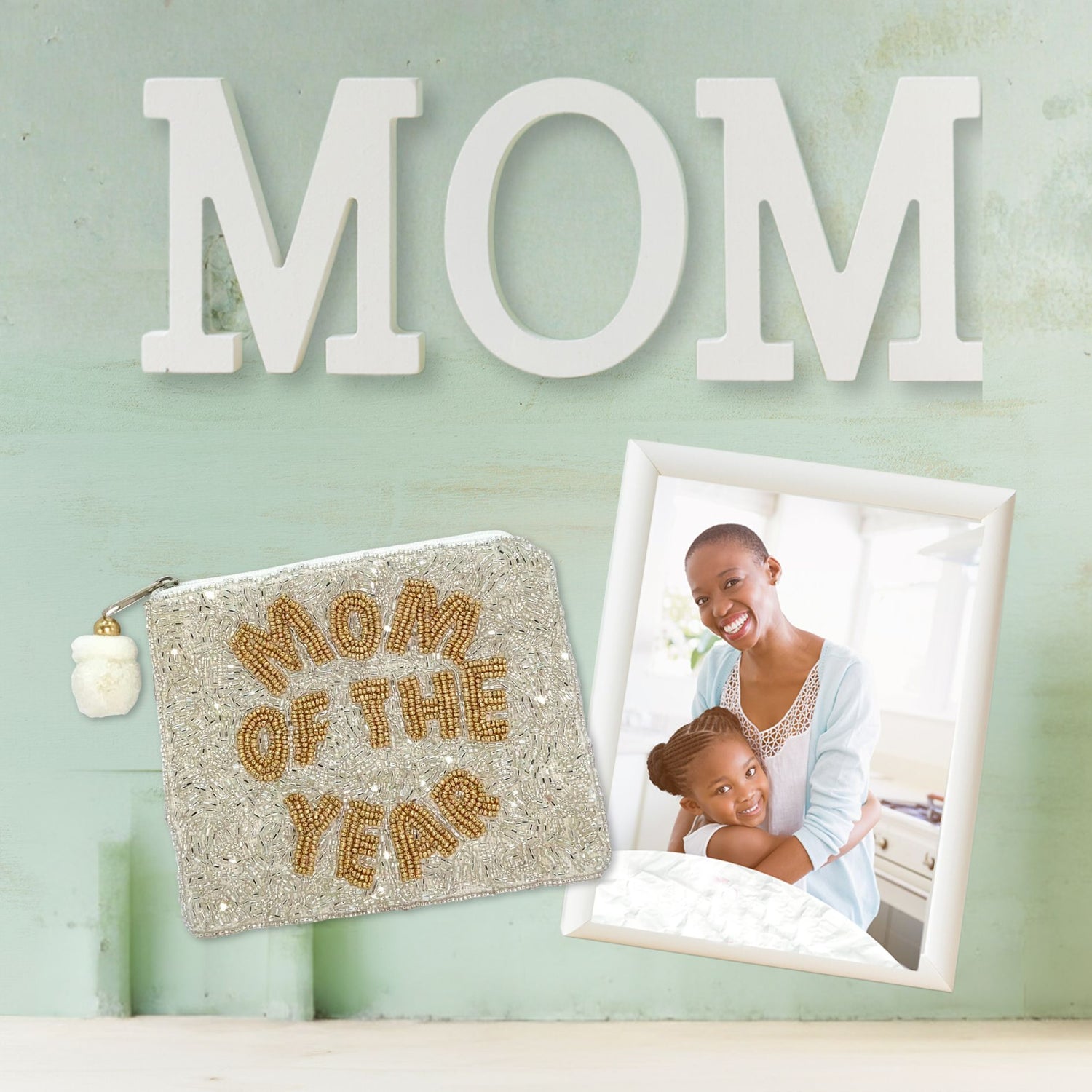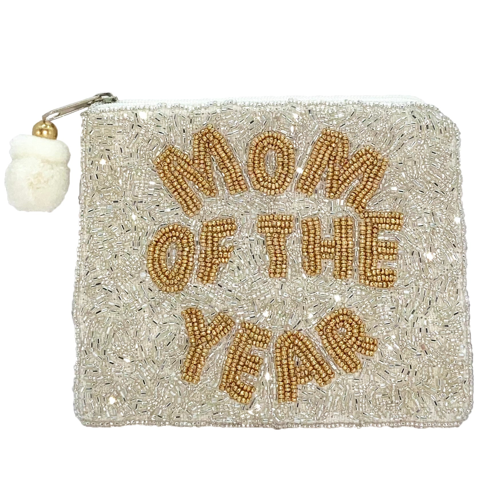 Celebrate the special mom in your life with our "Mom of the Year" Beaded Coin Pouch. The single-sided design features exquisite beadwork that proudly declares "Mom of the Year," making it a heartfelt and stylish accessory for any mother. The pouch is completed with a secure zipper closure and a charming pom-pom, adding a playful yet practical element.